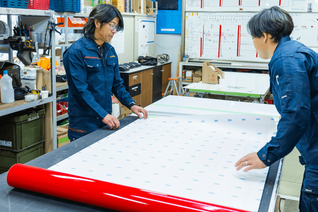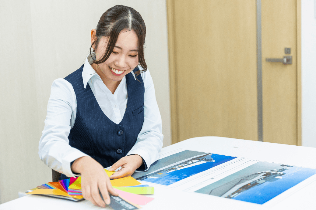 従業員の健康保険対応や書類全般、屋外広告物の申請対応、社用車の点検手続き、役所との調整、パソコンやタブレット設定、写真整理、メール対応といった、営業サポート全般を通してサンプロダクトを支えていく「縁の下の力持ち」的な存在です。